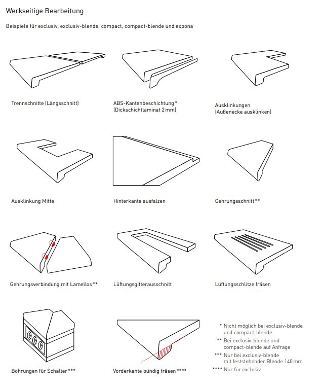 WERZALIT liefert Fensterbänke auf Wunsch fertig zugeschnitten - bei Bedarf mit entsprechenden Ausklinkungen, Ausfräsungen etc. Sie bezahlen die gelieferten Mengen und bezahlen nur einen geringfügigen Zuschnitt-Zuschlag. So sparen Sie viel Arbeit, tragen kein Verschnitt-Risiko und liefern beste Qualität. Als einziger Hersteller übernimmt WERZALIT für Sie das Beschichten offener Schnittkanten in Möbelqualität für einen geringen Aufpreis.